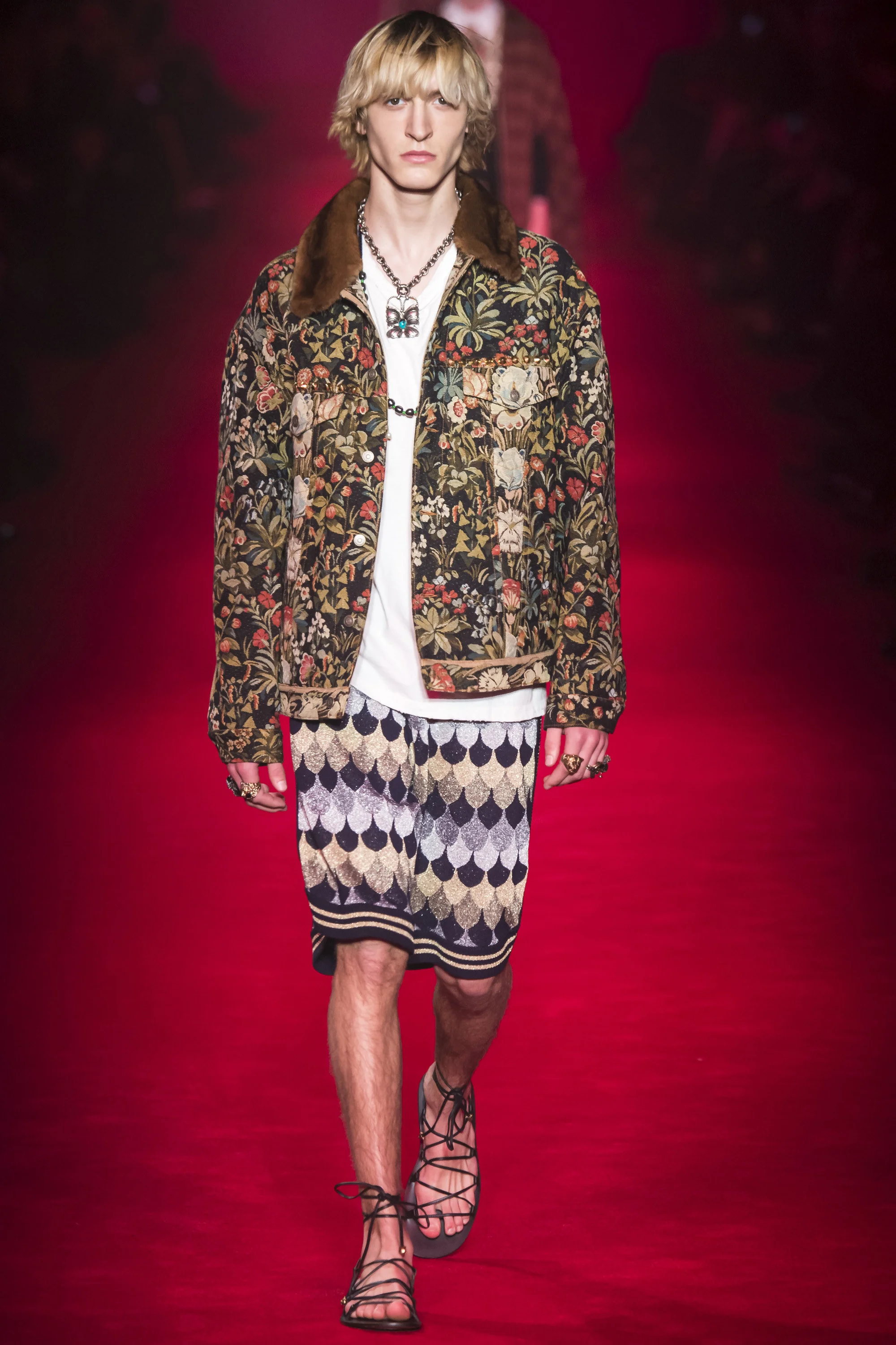 Okay, so Gucci, or shall I say new Gucci, is god. Alessandro Michelle is a detailing legend and this jacket is just unspeakably beautiful and abrasive in its texture. It grabs attention on a grand scale with not only it's unreal carpet like fabric but it's rose colored studs, red fur collar, and Chinese dragon embroidery. The stunt level is too high on this one, and it stood out as the most detailed outlandish piece on the Gucci runway. It's perfectly fit for a 70's shogun fashion lord.