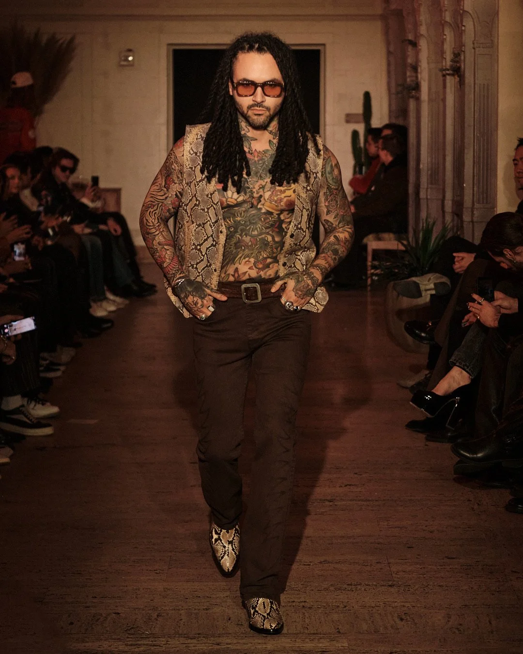 The collection itself draws from a rich tapestry of tonal hues to illustrate its vision. Brown jeans accompany a vibrant vest with python-print. Red work jackets meet cognac boots and cream trucker caps. Warm-colored cardigans with shaggy textures are donned with checked trousers. Black is a given. Leather is a staple. Glasses are essential. The iconography of musicians, nightclubs, art, and personalities of the past are well and alive through Midnight Rodeo. A hint of 70’s rockstar debonair. A tinge of Cobain-esque effortlessness. But most importantly, a desire to recreate the sentimentality and charm of the past while charging towards an uncertain future.